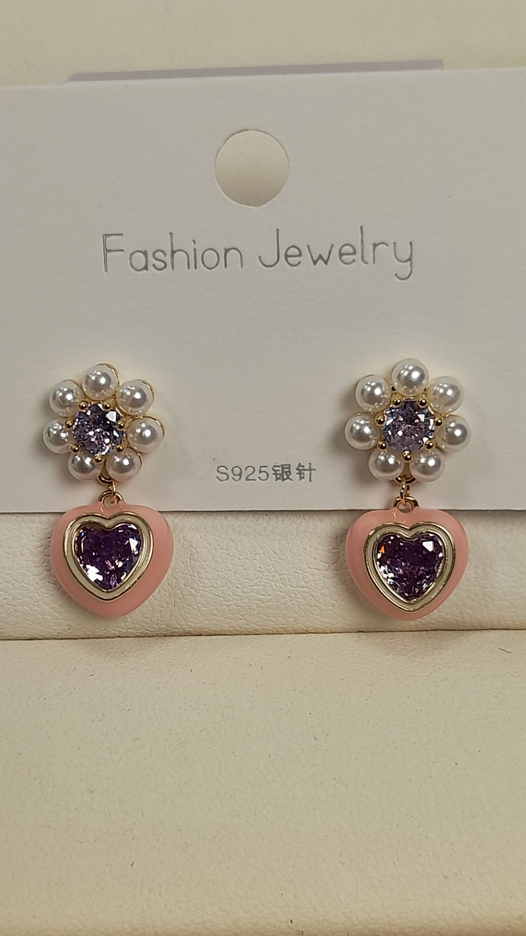 گوشواره آویز نگین قلبی صورتی کد 122